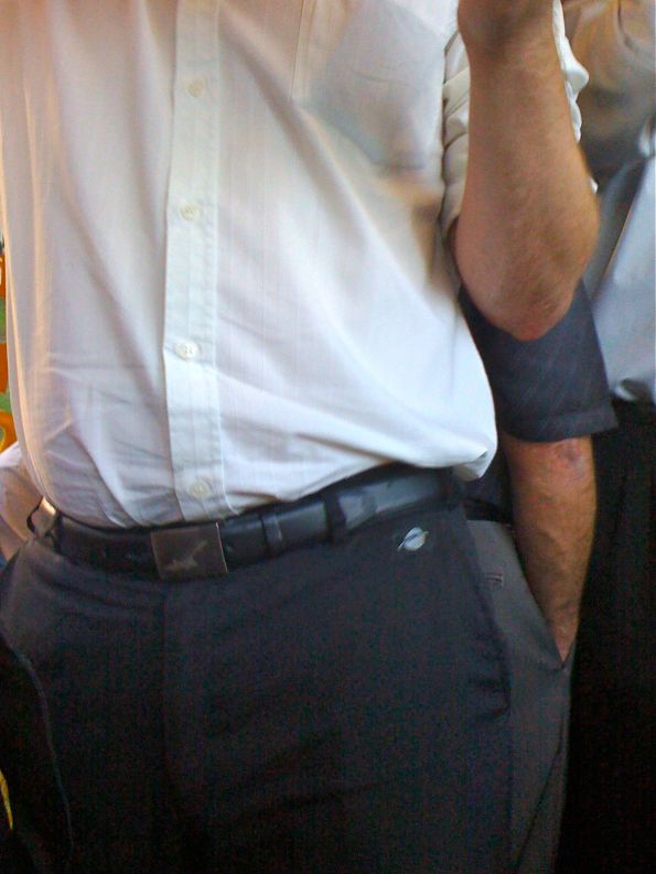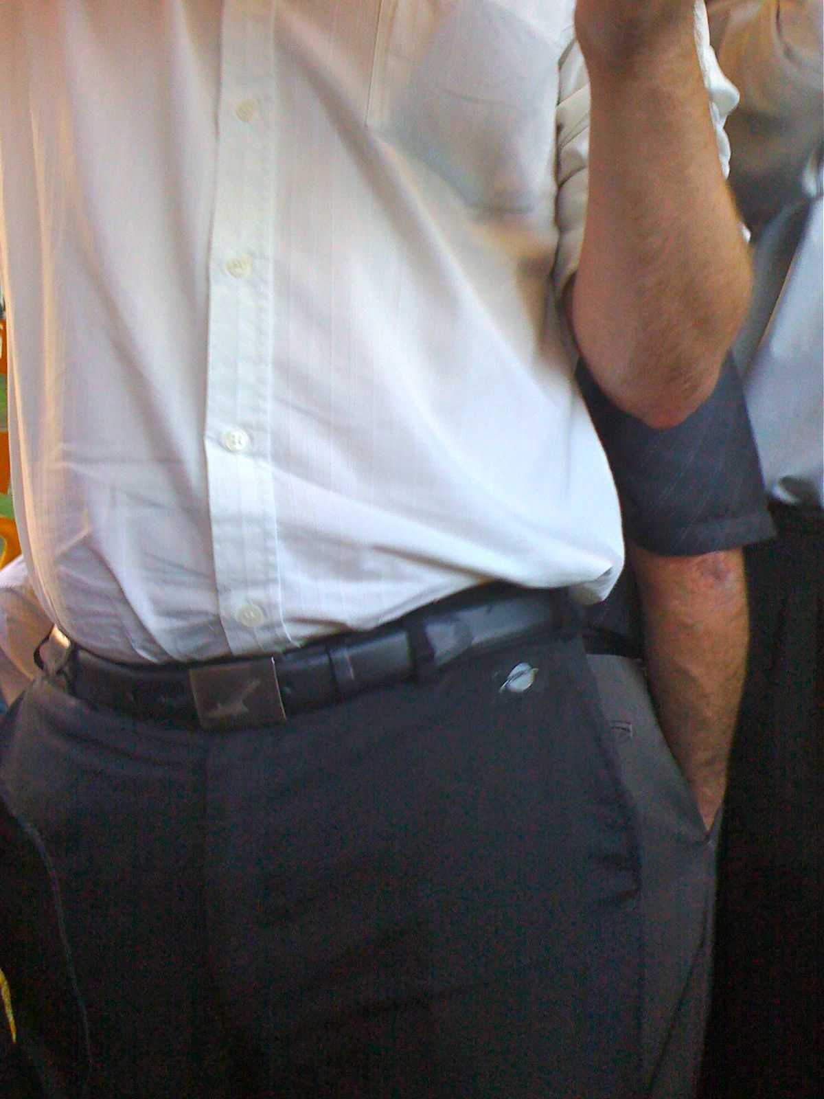 It was at my eye level, as I’d scored a seat, so it’s not like I was looking for mischief… Anyhow, take a look at this uplifting corporate uniform and note which way the little plane is pointing on the belt buckle.