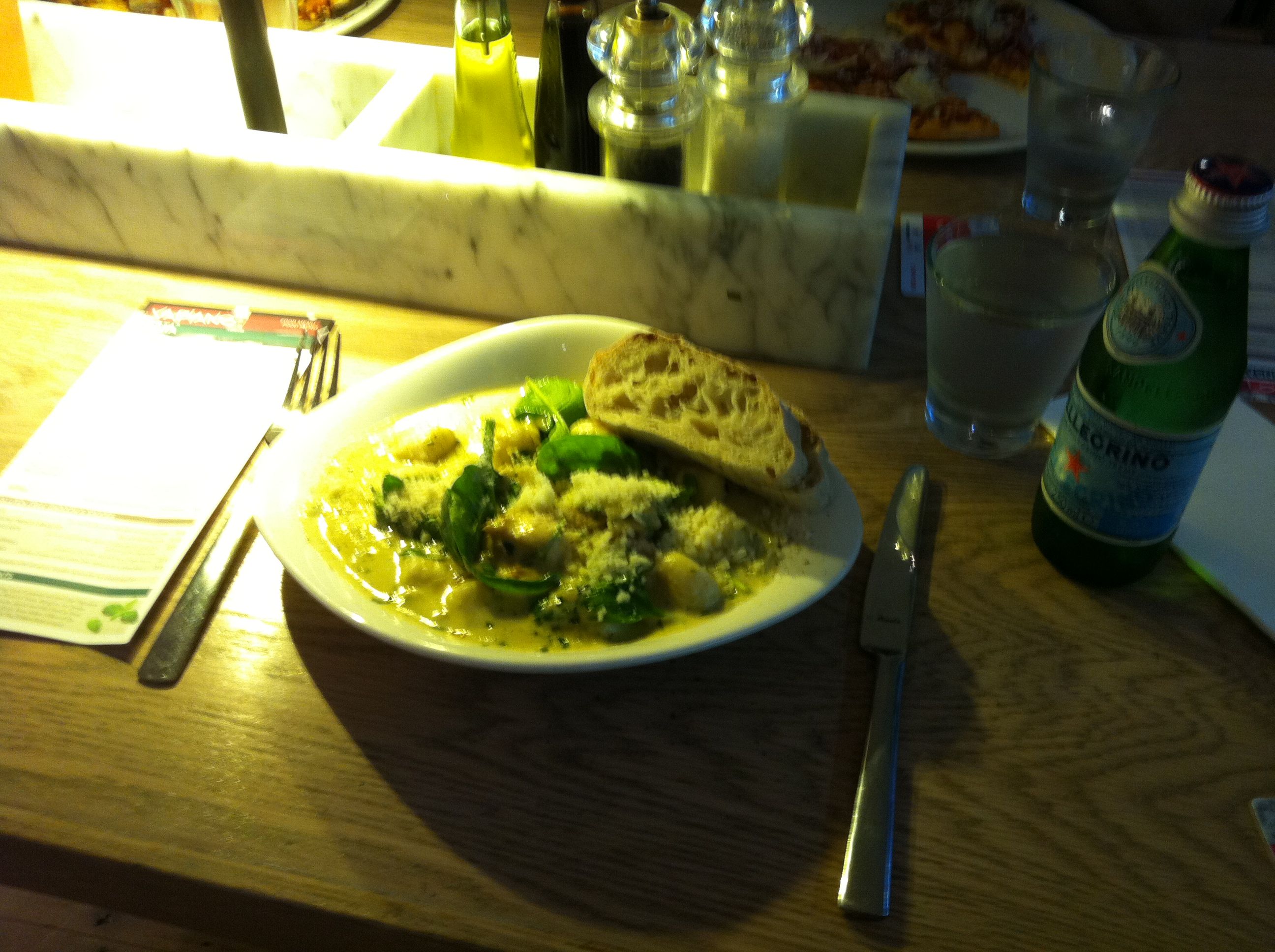 Gluten-free gnocchi with chicken breast, onion, pesto, baby spinach in a cream sauce (Pollo e spinaci)