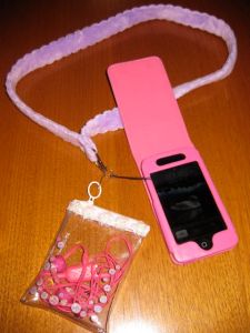 The laynard and case came from a mobile phone accessory store, and the purse I already had from a kids’ lip balm set (but zippered coin purses can be bought just about anywhere).