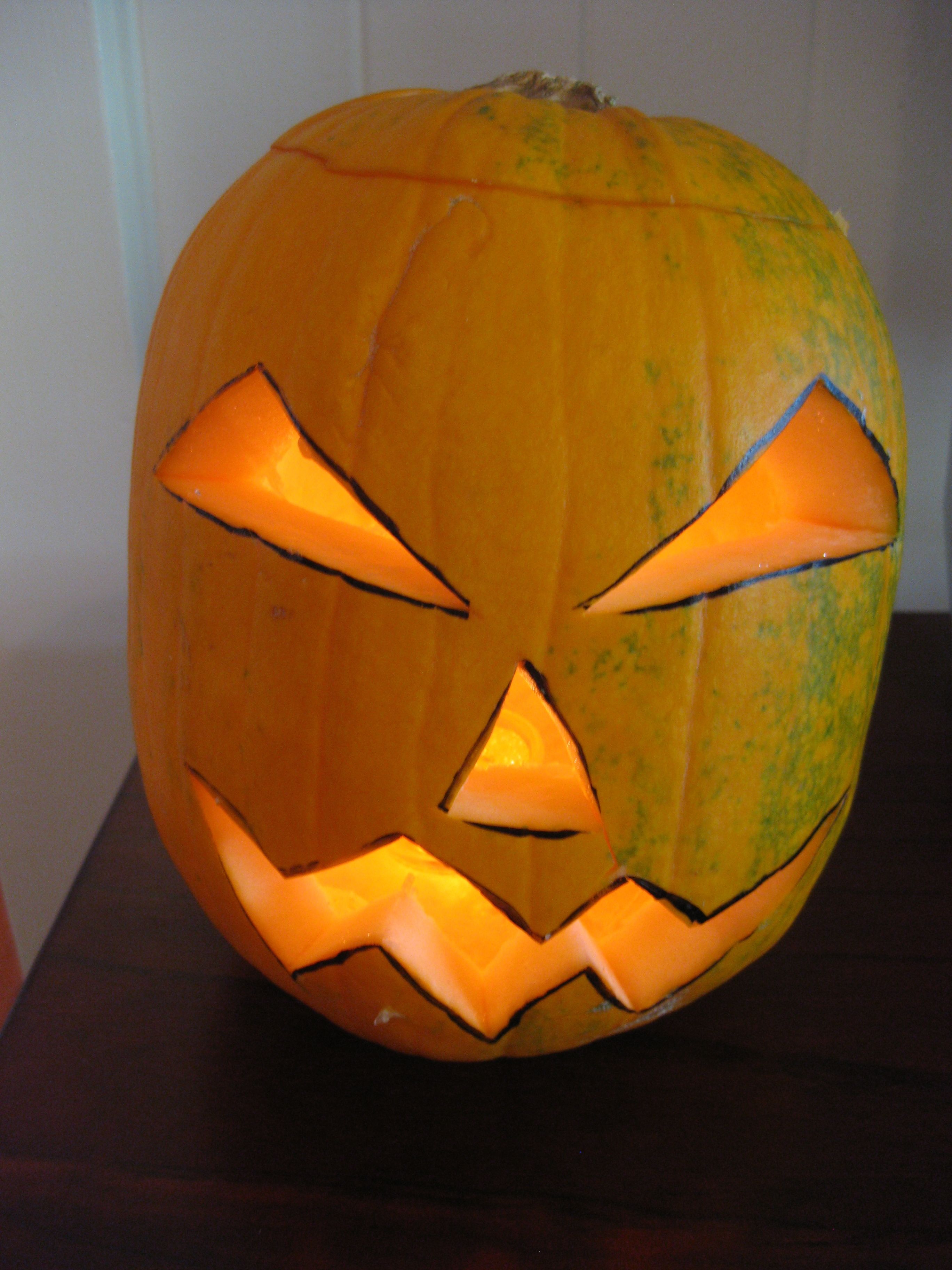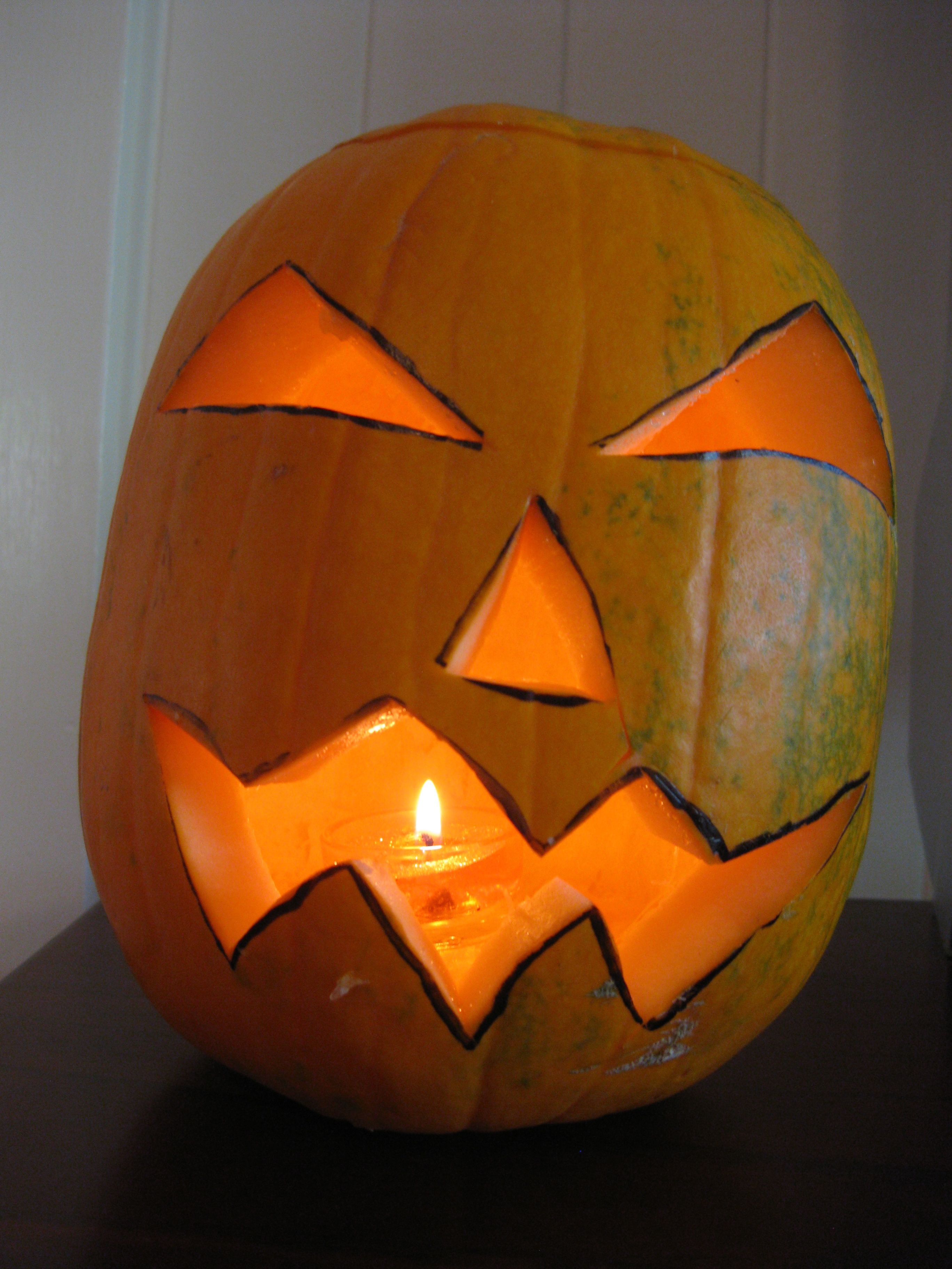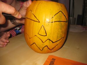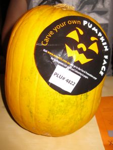 UPDATE: To avoid being gouged on the price of a Halloween pumpkin, try using a watermelon – it does work and you get to eat the insides. The Halloween pumpkin isn’t good eating. See my later post with photos of a Halloween watermelon, thanks to the Auntie-who-thinks-of-everything.