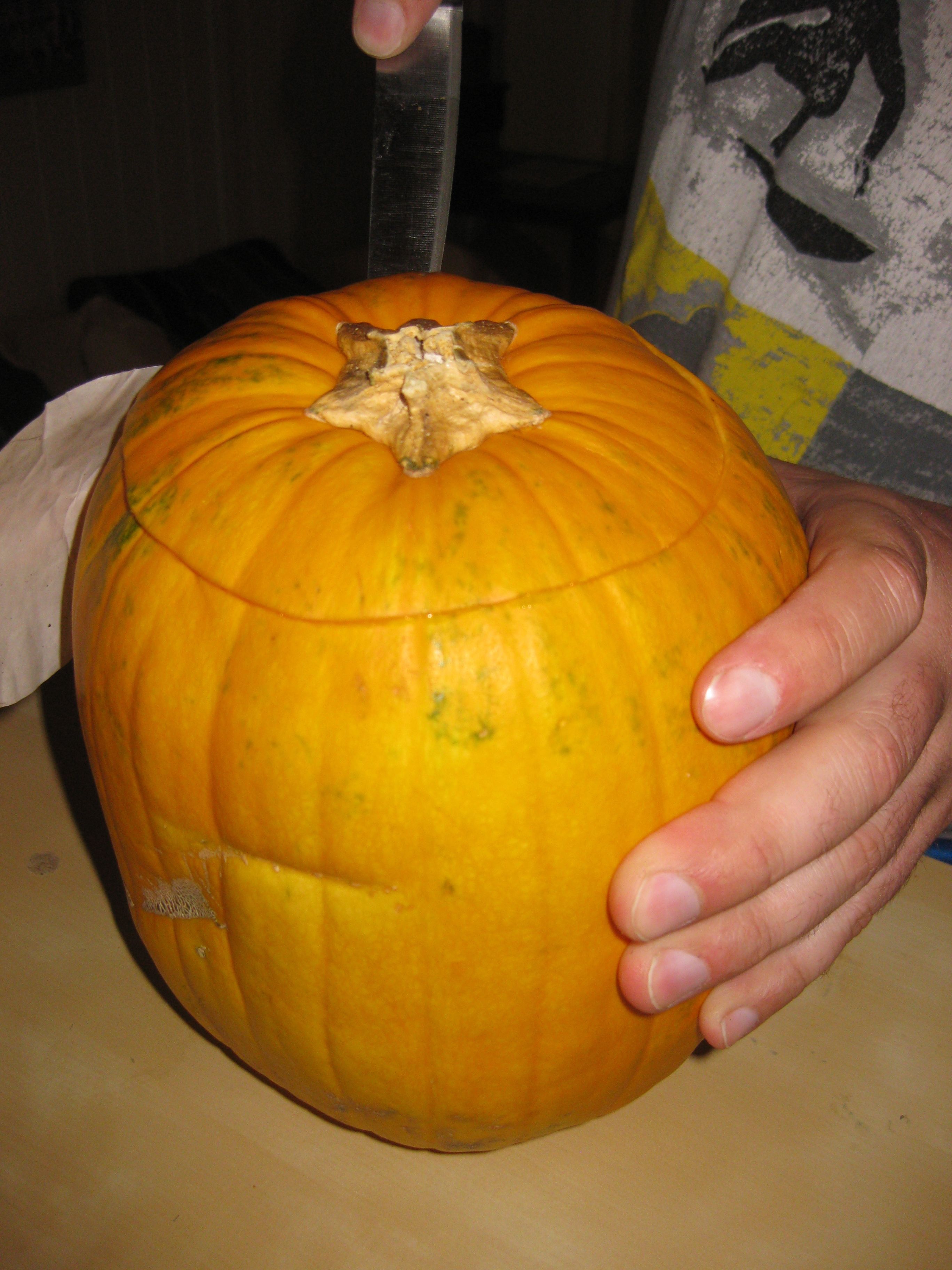 In short, it was as easy as falling off a log. Using the right kind of pumpkin makes all the difference. As you can see from the photos below, it’s a softer pumpkin which has a lot of ‘guts’ that’s easily scooped out by little kids. The cutting must be done by an adult (obviously, one would think). The supermarket instruction sheet sets out 8 steps, but really, there are only five, tops. To be clear, the hairy fingers in the photos are not my own. Yours Truly suffered a shoulder / neck injury while sleeping (how sad is that?) and couldn’t operate the knife without screaming like a banshee, so Dear Brother did the honours.
